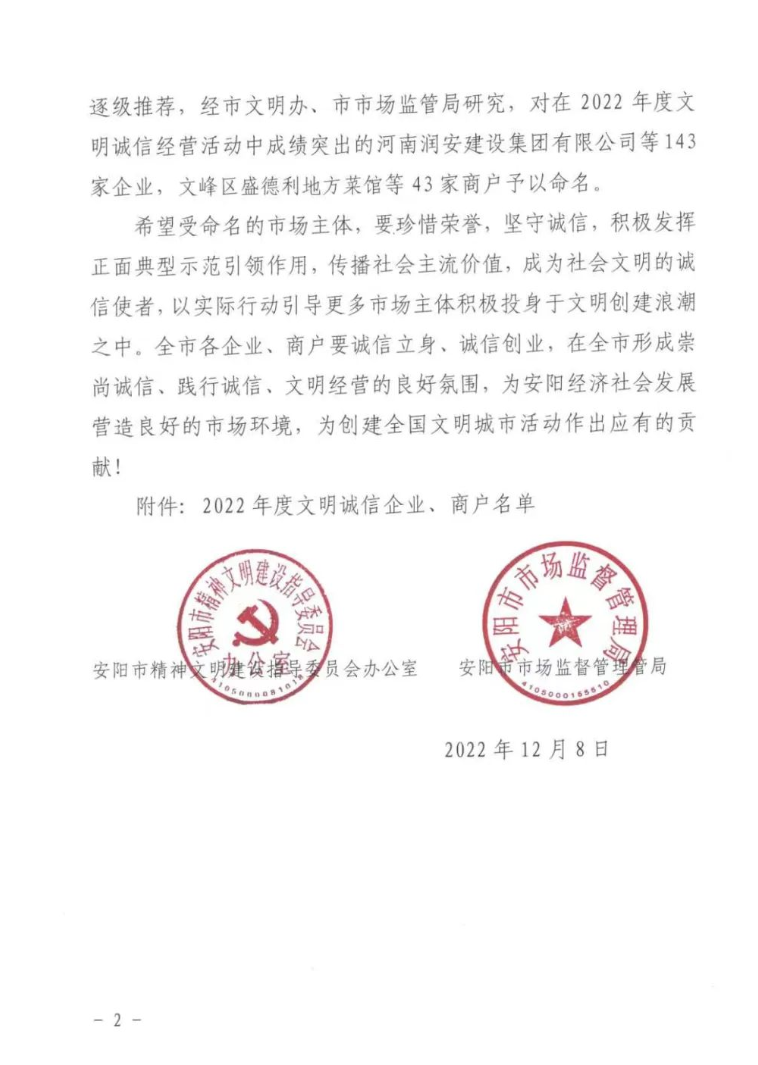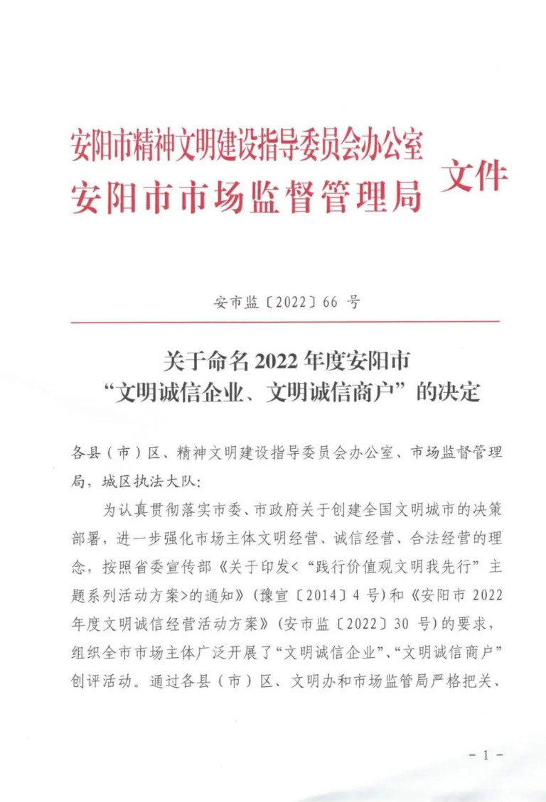 文件指出:為認真貫徹落實市委、市政府關(guān)于創(chuàng)建全國文明城市的決策部署,進一步強化市場主體文明經(jīng)營、誠信經(jīng)營、合法經(jīng)營的理念,組織全市市場主體廣泛開展了“文明誠信企業(yè)”、“文明誠信商戶”創(chuàng)評活動。通過各縣(市)、區(qū)文明辦和市場監(jiān)管局嚴(yán)格把關(guān)、逐級推薦,經(jīng)市文明辦、市市場監(jiān)管局研究,對在2022年度文明誠信經(jīng)營活動中成績突出的河南潤安建設(shè)集團有限公司等143家企業(yè)予以命名。具體文件如下: 潤安集團長期以來高度重視企業(yè)信用管理,堅持誠信經(jīng)營,傾力打造“潤安”品牌。此次獲評文明誠信企業(yè),充分說明了潤安集團在企業(yè)信譽、品牌建設(shè)方面得到了社會的高度認可,也必將成為公司高質(zhì)量發(fā)展的強大推動力。 下步,潤安集團將以此次表彰為契機,以習(xí)近平新時代中國特色社會主義思想和黨的二十大精神為指引,時刻保持依法經(jīng)營、誠信納稅的理念,積極發(fā)揮正面典型示范,樹立文明誠信的良好形象,堅持誠信立身、誠信創(chuàng)業(yè),為安陽經(jīng)濟社會發(fā)展?fàn)I造良好的市場環(huán)境,為創(chuàng)建文明城市助力加油,作出貢獻。